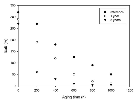 The measurements of EaB performed on the same cable samples confirm that aging continued during the storage time, see Figure 7, which shows the trend of EaB for cables aged at 85 °C and 0.42 kGy/h. Tensile tests have been performed at delivery time, after one year and five years of storage. As expected, mechanical properties are dramatically affected by post-irradiation phenomena, which continue to alter the response even after some years. As an example, at delivery time, 1000 h of aging are needed to obtain an EaB value of ≈50%, after one year, the aging period is reduced to 400 h and, eventually, after 5 years of storage, even the 200 h-aged sample has an EaB lower than 50%.