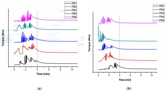 In all samples, initial high filling peaks appear due to the addition of solid PP (MAH and BPO coated) pellets into the mixer. Torque on the curve shows continuous variation. This unbroken disturbance reflects the feeding and molten accumulation of PP. A high value of torque is visible during the initial 2–4 min due to friction, high viscosity, and surface melting of PP pellets [28].