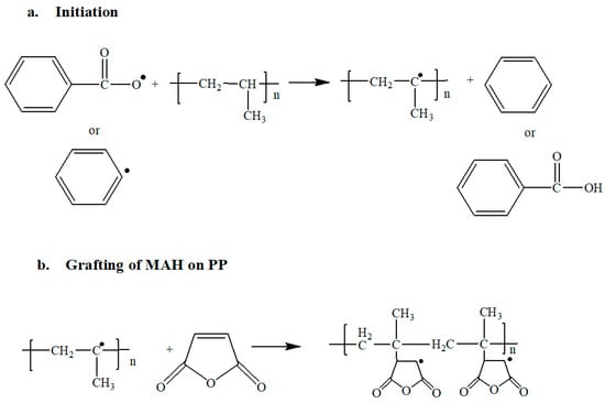 (a) Initiation reaction for the grafting by free radical polymerization. (b) Grafting of MAH ring on the backbone of PP.