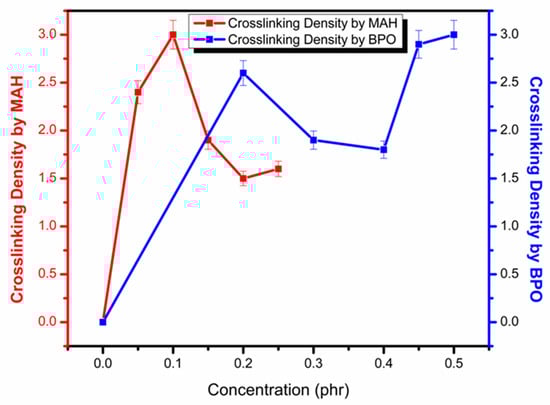 Crosslinking density in PP by adding MAH and BPO was calculated using the difference between initial and final torque values [21]. An increase in the value of crosslinked density shows that more complex structures are formed as well as gel formation. The gel formation is not required and reduces the grafting percentage. Figure 3 explains the trends in crosslinking density by varying MAH and BPO concentration. It is clearly visible that when BPO amount is increased at constant MAH, overall, the crosslinking density increases due to a large number of free radicals that attack on the PP chain and produce many complex structures and gel structures. However, at constant BPO, initially at 1.0 phr MAH, crosslinking density increases due to side chain reactions; however, after this concentration, free radicals possessed more available sites for attack, and the reaction moved towards grafting [21].
