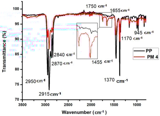 FTIR spectra of pure polypropylene (PP) and highest MAH-grafted PP (PM4) are shown in Figure 4. In both spectra, peaks are observed at 2950 cm−1 due to the asymmetric stretching in the methyl group (-CH3). At 2915 cm−1 peak is due the asymmetric stretching in the methylene group (-CH2-), 2870 cm−1 for -CH3 symmetric stretching, and 2840 cm−1 for -CH2-symmetric stretching. Bending peaks of -CH2- and –CH3 are observed at 1455 cm−1 and 1370 cm−1, respectively. In all grafted samples, two peaks appeared at 1750 cm−1 for the carbonyl (C=O) group of the five-membered ring anhydride and the C=C peak at 1655 cm−1. From the FTIR spectra of all PP grafted samples, the carbonyl index (CI) was calculated using Equation (5) [5].