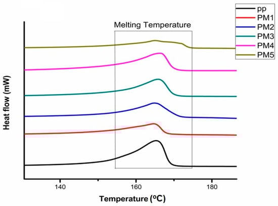 where is the heat of fusion of grafted PP and is the fusion heat for a theoretical 100% crystalline PP [6]. 207 J/g is the value used for the enthalpy of fusion for 100% crystalline PP obtained from literature [29]. A comparison of the DSC thermograms of processed samples by reactive extrusion with varying MAH content is shown in Figure 5.