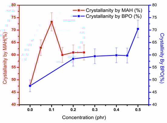 It is observed that in all processed samples, the percentage of crystallinity is much higher. This behavior is due to the addition of BPO and MAH, which causes degradation of the PP chains into shorter chains [5]. Chain scission caused a reduction in molecular weight and further reduced entanglement in chains. This reduction enabled a rise in the degree of order of PP chains and hence caused an increase in overall crystallinity [4,5]. When BPO content increased, chains scission increased due to a high level of degradation; thus, the percentage crystallinity remained high for all samples [5]. However, after increasing the MAH concentration at 1.5 phr, percentage crystallinity is noted to be reduced. The reason for this slight fall is MAH attachment on chains, which reduced chain packing [30].