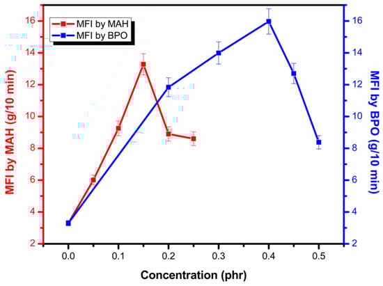 Figure 8 displays the variation in MFI by altering MAH and BPO amounts. When adding low content of MAH and BPO, the MFI value increases remarkably. By adding MAH and BPO, chains scission occurs due to termination by disproportionation and chain transfer, and due to the presence of possible side reactions. It can be inferred that a combination reaction for termination is less probable than chain transfer or disproportionation [5]. Shorter chains with low molecular weight caused a high flow rate. As the concentration of MAH and BPO was further increased, complex molecules started to form, which resulted in lower MFI values [5].