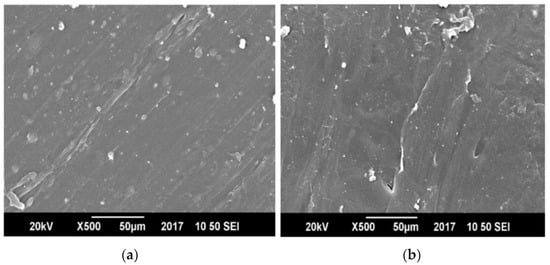 Figure 9 shows that pure PP and PET possess totally uniform microstructures and that there are no phase boundaries. However, the blends of PP and PET showed phase boundaries. The presence of MAH-g-PP in PET and PP blends promoted the formation of very fine and dispersed morphology, better adhesion, and partial uniformity (Figure 10a) than an un-compatibilized blend (Figure 10b). This increase in fineness of the prepared blends showed lesser voids and hence decreased the passing of small molecules across the films and overall reduced its water permeability. The blend having no MAH-g-PP showed phase separation and voids due to lack of compatibility between PET molecules and PP chains [31,32,33]. Figure 11 shows the comparison of PET and PP blends by changing the concentration of MAH-g-PP.