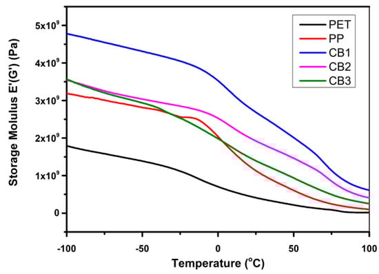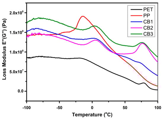 Figure 15 presents the change in loss modulus by increasing temperature for the compatibilized blends of PET/PP in contrast to pure PP and pure PET. It displays the energy dissipation for prepared samples. The value of loss modulus and storage reduces due to the smaller force needed for deforming the sample. Initially, all samples hinder the segmental motion of molecules, but with a rise in temperature, the molecular motion of this type is activated. From figure the Tg of PET is 82 °C that is nearly the same value found from DSC analysis. The Tg of pure PP appeared at −15 °C. By forming a compatibilized blend of PET and PP, in CB1, the Tg of PP slightly shifted to about 10 °C, and the Tg of PET was unnoticeable. It can be inferred that CB1 has improved compatibility between PP and PET components. CB2 and CB3 also presented an increase in the value of Tg of PP; and these two compatibilized blends also displayed the Tg of PET at 90 °C temperature [36,37].