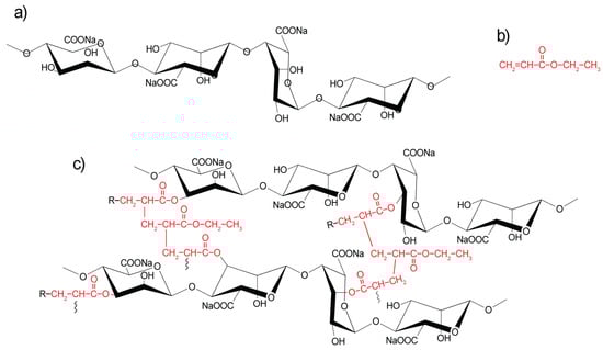 In this context, acrylic polymers are an option to modify polysaccharides, as is the case with sodium alginate [,,]. For example, poly(ethyl acrylate) is used to improve the physical properties of synthetic polymers and to improve the properties of polysaccharides, such as cellulose fibers from wood pulp and other renewable materials such as tamarind seeds [,].