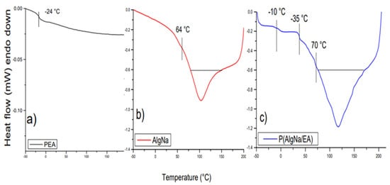 Figure 4 shows DSC thermograms curves for (a) PEA, (b) AlgNa, and (c) poly(AlgNa/EA). To determine glass transition temperatures, the point where the slope of the curve changes slightly was found, and the corresponding enthalpies were calculated by measuring the area in the curve delimited by a straight line []. In Figure 4a, the glass transition temperature of the PEA was −24 °C. In Figure 4b, sodium alginate’s Tg is 64 °C; there is a wide endothermic peak, which starts around 80 °C and ends at 150 °C, and ∆H = 10 Jg−1, where the area under the endotherm associated with Tg is defined as enthalpy recovery or relaxation and evaporation of water linked. Several authors generally attribute this process to gelatinization [,]. However, we consider that claim to be inaccurate, and would not attribute it to gelatinization but relaxation enthalpy []. On the other hand, the TGA analysis of AlgNa shows a loss of mass in this interval, which could also be due to the evaporation enthalpy of water molecules linked to the polysaccharide corresponding to non-freezing bound water []. Glass transition is often referred to as a second-order phase transition that occurs without the release or absorption of latent heat. However, due to the non-equilibrium nature of the glassy states, the glass transition is preferably called a state transition, rather than a phase transition [].