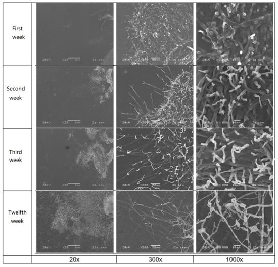 The determination of the biodeterioration of plastics due to the action of bacteria and fungi can be carried out through international standards, in which the type and extent of the biodeterioration can be determined by visual examination, by mass variations, and by variations in other physical properties. The tests may apply to all products made of plastic materials that have a flat surface and can be easily cleaned []. Figure 5 shows an SEM image of the growth of fungus Alternaria sp. over the copolymer poly(AlgNa/EA) film as a function of time; the growth of the fungus on the polymer membranes was inspected every week for two months (12 weeks). In Figure 5, only weeks 1, 2, 3, and 12 of the study are shown because the biodeterioration changes observed in those weeks were deemed the most representative. The microscopic characteristics of the fungus Alternaria spp. are hyphae, spores, and conidia.