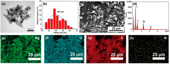 (a) Transmission electron microscopy (TEM) image; (b) particle size distribution of MgO; (c) scanning electron microscopy (SEM) image of MgO@CTAB; (d) energy-dispersive X-ray (EDX) result; EDX mapping element of (e) Mg, (f) O, (g) C, and (h) N.