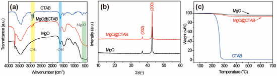 (a) Fourier-transform infrared (FT-IR) spectra, (b) XRD patterns, and (c) thermogravimetric analysis (TGA) curves of MgO and MgO@CTAB.