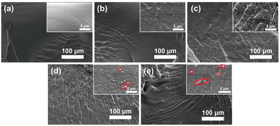 The fracture surface morphology of the PBAT nanocomposite was evaluated by using SEM, as shown in Figure 3. It is observed that MgO@CTAB-0 in Figure 3a exhibits a smooth surface due to its brittle fracture of PBAT. In addition, the fracture surfaces of the PBAT nanocomposites become rougher (Figure 3b–e) with the increasing MgO@CTAB loading, indicating that the presence of rigid MgO@CTAB nanoparticles contributes to the stress transformation [25]. Some aggregations (red circles) are observed on the fracture surface in the high-resolution SEM images when the content of MgO@CTAB is increased to 5 wt%.