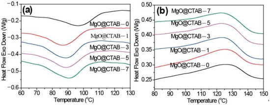 where ΔHm represents to the melting enthalpy, Wf is the weight ratio of MgO@CTAB, and ΔH0 stands for the 100% melting enthalpy of PBAT (114 J g−1) [26].