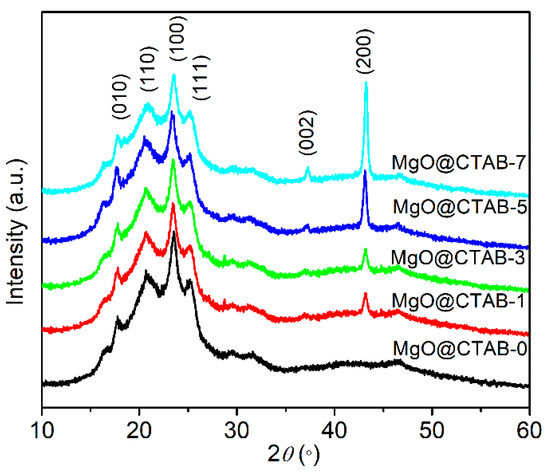 The XRD patterns of PBAT nanocomposites are shown in Figure 5. Four diffraction peaks at 17.4°, 20.4°, 23.3°, and 25.1° are observed in MgO@CTAB-0, which correspond to the (010) (110) (100) and (111) planes of PBAT, respectively [27]. Furthermore, the intensity of the characteristic peaks at 37.3° and 43.2° gradually increases as the content of MgO@CTAB increases from 1 to 7 wt%, which are related to the (002) and (200) planes of MgO. In addition, it is noted that there is no significant shift or change in the diffraction peaks between pure PBAT and its nanocomposites.