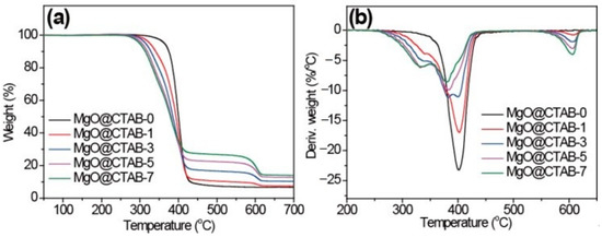 The effects of MgO@CTAB on the thermal stability of PBAT were investigated through TGA, and the results are shown in Figure 6. The initial decomposition temperatures (T10), peak decomposition temperatures (Tp), and char yields at 700 °C are listed in Table 2. In Figure 6, it is observed that the decomposition curves shift to lower temperatures with the increasing loading of MgO@CTAB. The T10 of MgO@CTAB-7 decreases from 375.2 to 313.7 °C as compared with that of MgO@CTAB-0. In addition, the values of Tp exhibit a similar decreasing trend. The decrease in thermal stability is mainly attributed to the catalytic effects of MgO, which is consistent with other reports [28]. Furthermore, the thermal decomposition of coated CTAB also resulted in weight loss. As expected, the char yields of PBAT nanocomposites at 700 °C increase gradually with the increasing content of MgO@CTAB.