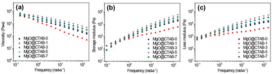 The effects of MgO@CTAB on the rheological properties of PBAT were evaluated by taking dynamic rheological measurements. The complex viscosity (η*), storage modulus (G′), and loss modulus (G″) as a function of frequency at 150 °C are shown in Figure 7. In Figure 7a, the η* of all samples exhibits a typical shear thinning behavior. It is worth noting that the values of η* and G′ of MgO@CTAB-1 decrease significantly as compared with those of pure PBAT, which is consistent with the reported PBAT composite [29]. This may be ascribed to the presence of CTAB because it is a small molecule that improves the flowability of PBAT. The storage modulus of the PBAT nanocomposite in Figure 7b increases with the increasing content of MgO@CTAB. However, the enhancement of the storage modulus is not proportional to the content of MgO@CTAB. Enhancement of the storage modulus reaches its maximum value at 5 wt% of MgO@CTAB and then decreases with further loadings. This is due to the fact that the enhancement of MgO@CTAB is more profound than the inverse effect of the aggregation of MgO@CTAB in the PBAT matrix at the loading of 5 wt% MgO@CTAB. Figure 7c shows that the values of G″ decrease concomitantly with G′, indicating that the structure of the PBAT nanocomposites is most affected by filler content.