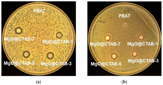 The antimicrobial activity of the PBAT nanocomposite films against S. aureus and E. coli is shown in Figure 9, and the bacterial inhibition zone data are listed in Table 4. It is clear that no inhibition zone is observed for MgO@CTAB-0 film, indicating that pure PBAT film has no antibacterial activity against S. aureus and E. coli. The addition of MgO@CTAB endows the PBAT nanocomposite with antibacterial activity [10,14]. Moreover, the bacterial inhibition zone increases gradually with the increasing content of MgO@CTAB. These results can be ascribed to the superior antibacterial properties of MgO. However, PBAT/MgO@CTAB exhibits better antibacterial efficiency against S. aureus than against E. coli, which is similar to other studies in the literature [31,32,33,34]. This phenomenon is ascribed to the fact that the peptidoglycan membrane of the Gram-positive bacteria S. aureus is much thicker than that of the Gram-negative bacteria E. coli, and as a result, the released Mg ions do not easily penetrate the peptidoglycan membrane and disrupt the essential enzyme systems in the bacteria.