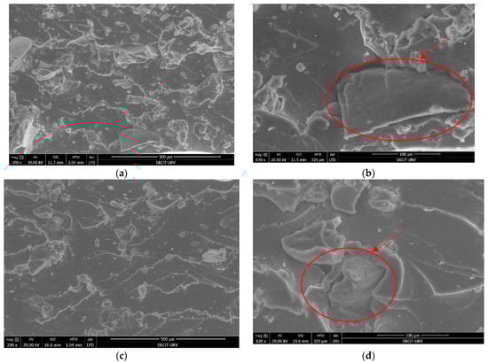 SEM micrographs of EDPM at 20% GTR (a,b) and at 10% GTR (c,d), and at different magnifications: 200× (a,c) and 630× (b,d).