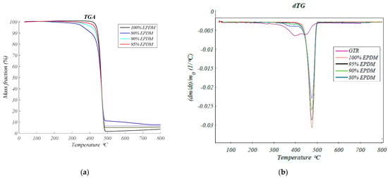 Thermogravimetric analysis: (a) Mass fraction (%) versus Temperature (°C), for EPDM and EPDM/GTR samples; (b) Rate of weight loss versus Temperature (°C), for EPDM and EPDM/GTR samples.