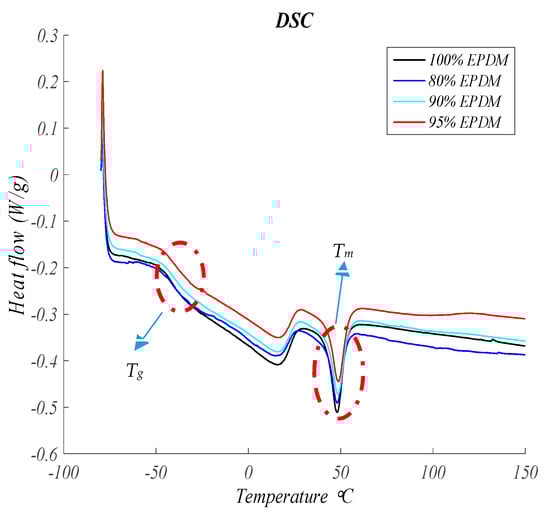 Figure 3 shows the DSC thermograms at 10 °C/min of al formulations studied. It can be observed the Tg (glass transition) at low temperature (amorphous part) and the melting peak (crystalline part) at a higher temperature. Ethylene-Propylene-Diene-Monomer Rubber (EPDM) shows a semicrystalline behavior with values of Tg and Tm (Table 2) similar to the reported in the literature [36].