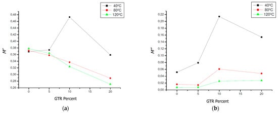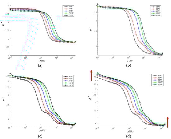 Figure 4 and Figure 5 show the values of the real permittivity and imaginary permittivity in the range of the frequency for different temperatures (from 40 to 120 °C) for each one of EPDM/GTR composites. According to Figure 4 and Figure 5 both, real and imaginary permittivity are influenced by the content of GTR, frequency, and temperature. Both increase with increasing GTR content and increases also with temperature, at the same level range of frequencies, and decreases of ε′ with rises of frequency, at the same temperature and/or GTR percent. In this sense, increases in frequency cause slight increases in losses (ε″) in compounds with low GTR contents until reaching a maximum, after which the effect is slightly reversed. As the temperature increases, the permittivity increases because the mobility of some segments in the polymer chain also increases. Although in general, the shape of the real part of the permittivity undergoes minor changes.
