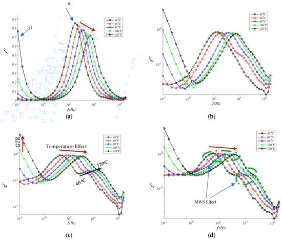 In turn, in the same frequency interval, a peak in M″ develops, indicating the presence of relaxation processes. These peaks correspond to α relaxations that are formed at high temperatures (≈Tg of the resin) when the mobility of the polymer molecules is high enough [48]. On the other hand, unlike what occurs in the measurement of dielectric losses, in the case of the study of M″ a new relaxation at high frequencies can be appreciated that can be attributed to a phenomenon of the Maxwell-Wagner-Sillars type (MWS). This kind of relaxation has its origin in the interfacial polarization and appears in heterogeneous materials, such as partially crystalline or semicrystalline polymers, such as EPDM, they contain crystalline regions with conductivity and permittivity different from the amorphous regions [49]. Therefore, Figure 9 allows us to simultaneously see the evolution with temperature and frequency for different percent amount of GTR in the EPDM matrix. At least three relaxation peaks are observed: β (low frequencies, below 10−2 Hz), α (medium frequencies, over 102 Hz), and MWS (medium/high frequencies, over 104 Hz). These dielectric relaxation peaks are thermally activated phenomena, and they are moved to higher frequencies as the temperature increases as we have seen in Figure 9. This allows an analysis of the dependence of each dielectric relaxation with temperature.