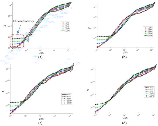 At constant temperature, the conductivity AC can be expressed as σac = σdc + A·ωs, where σdc is the limit value (ω → 0) of σac, A and s are parameters dependent on temperature and filler content [42,43], therefore, the AC conductivity (σac = ε0 · ω · ε″) of composite materials depends on the test temperature and the frequency ranges, and conductivity rises with increasing one of them. This can be seen in Figure 6, where at low frequencies the influence of DC conduction (direct current) is very important and the dependence on the frequency can be expressed through a power law of the type σac ~ ωs (0 < s < 1) [44,45]. In general, conductivity is higher in samples with higher GTR particle content, which suggests that GTR favors the transfer of electrical charges at the EPDM-GTR composite interface. The conductivity values alternate by an order of magnitude with temperature, indicating the existence of thermally activated processes.