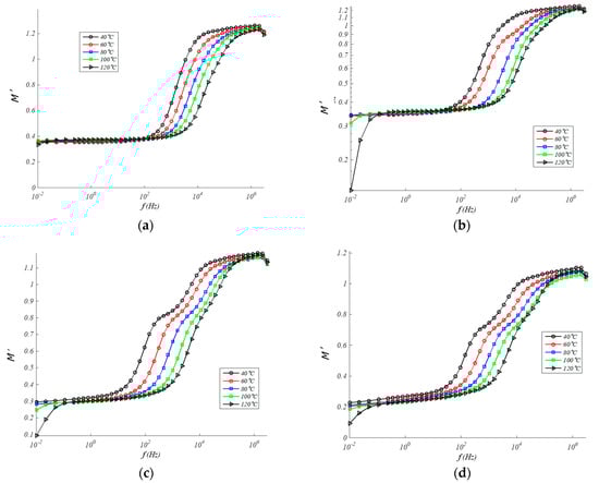 To facilitate the study of relaxation phenomena, the electrical modulus formalism is commonly used [46,47]. In Figure 7 and Figure 8 the real electrical modulus (M′) and imaginary electrical modulus (M″) are observed for compounds with different concentrations of GTR as a function of the frequency and in a temperature range from 40 to 120 °C. In the composite samples, interfacial polarization phenomena are happening due to the presence of the GTR phase in the EPDM and GTR composite. M′ rises with ascents frequency up to reach a constant value, over 10−6 Hz. In general, low changes are seen in M′ (Figure 8) with percent GTR of increasing amounts.