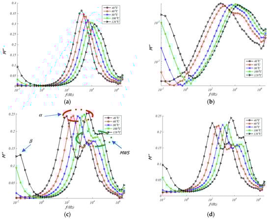 The dielectric response of polymeric materials at various frequencies can be described in terms of the complex relative permittivity εr*. To describe the effect of the polarization of the electrode and solve the relaxation at low frequencies, the term “electric modulus” was used. The electric modulus was introduced by McCrum et al. [37] and is used for the study of electrical relaxation phenomena in many polymers [38,39,40,41] and has been used for the present dielectric characterization and analysis. Electrical Modulus is defined by Equation (1), where M′ and M″ are, the real and imaginary part of the electrical modulus.