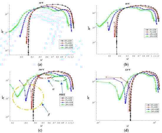 Imaginary modulus in EPDM composites for: (a) 0% GTR or neat EPDM; (b) EPDM + 5% GTR; (c) EPDM + 10% GTR; (d) EPDM + 20% GTR.