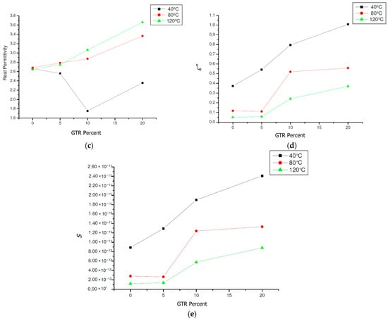 EPDM and GTR samples composites dielectric behavior, at frequency: 50 Hz, and different temperatures: 40 °C, 80 °C and 120 °C (a) real modulus; (b) imaginary modulus; (c) real permittivity; (d) imaginary permittivity; (e) S-Conductivity (S/cm) in EPDM composites for neat EPDM (0% GTR) and EPDM and GTR (5–10–20% GTR).