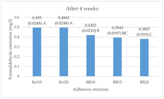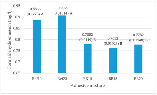 Free formaldehyde emission (mg·L−1) in five-layer plywood panels produced with UF resin and three addition levels (10%, 15%, and 20%) of BB as adhesive filler, measured after four weeks. Different letters denote a significant difference. Means followed by the same letter do not statistically differ from each other (p ≤ 0.05).