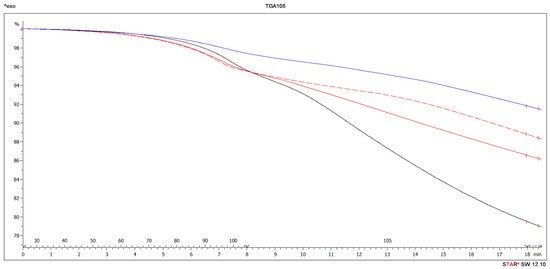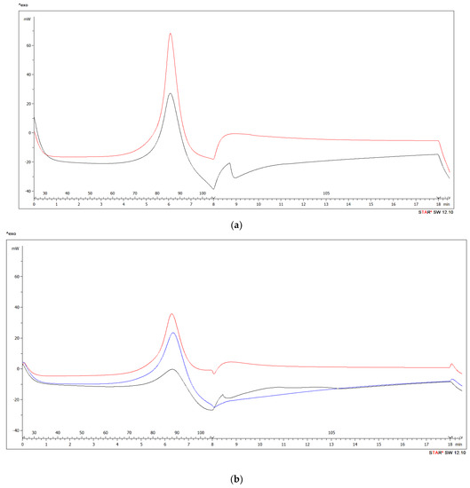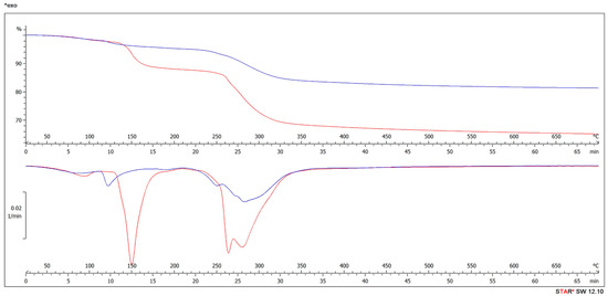 The device TGA/DSC1 was employed to measure the changes of mass in the samples and to monitor the temperature processes. TGA measurement was realized in alumina crucible with lids and with diameter of 6 mm and length of 4.5 mm. The total volumes of the crucibles were 70 μL and the lids were pierced. Simultaneously with the thermogravimetric analysis, a DSC measurement was performed. The sample was weighed by scales KERN ABT 220-5DM version 1.2 03/2013 (Kern & Sohn GmbH, Balingen, Germany) into a 100 μL aluminum crucible with a diameter of 6 mm and a height of 4 mm.