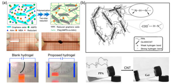 (a) Schematic representation of the fabrication of rGO/poly(AMPS-co-AAm) nanocomposite hydrogels. Photographs show their improved mechanical properties and obvious electro-responsive bending behaviors. (b) The formation of ox-MWCNTs/PPA hydrogels via hierarchical hydrogen bonds. Adapted with permission from Refs. [15,16].