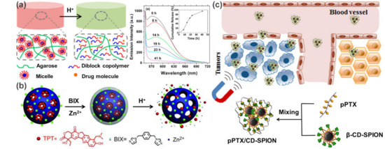 Controlled drug delivery systems for cancer theranostics. (a) Agarose hydrogels embedded with pH-responsive micelles for pH-triggered drug release. (b) Schematic illustration of the preparation and pH-responsive release of coordination polymer coated MSNs. (c) Schematic illustration of the fabrication of pPTX/CD-SPION nano-assemblies and their application in magnetically guided drug delivery. Adapted with permission from Refs. [42,43,46].