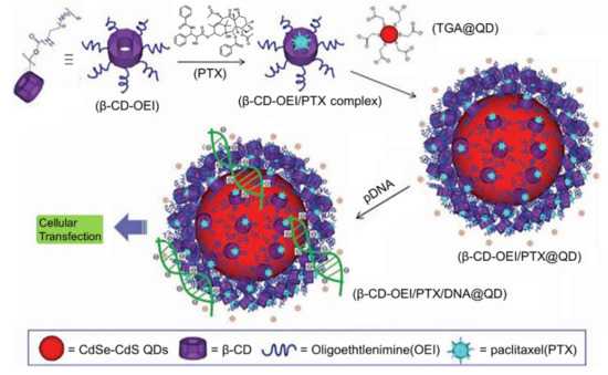 Recently, simultaneous drug delivery and bioimaging function for both therapeutic and diagnostic purposes has received much attention because it may achieve better anticancer efficacy. A typical example of such systems was described by Li et al. [55], who constructed a novel multifunctional supramolecular hybrid nanocarrier with synergetic gene and drug co-delivery, and simultaneous cellular imaging function (Figure 7). In this design, a core-shell fluorescent probe (β-CD-OEI@QD) can be prepared by electrostatically coating a red QD with a star-shaped cationic β-CD polymer (β-CD-OEI). Taking advantage of the robust guest binding capacity of β-CD cavity and their positive surfaces, the resultant β-CD-OEI@QD complex is able to function as a carrier for co-delivery of paclitaxel (PTX) and gene. In addition, the fluorescence imaging function allows the localization and tracking of the delivery systems in living cells. Because PTX and the gene behave in a co-operative way, a great enhancement in the gene expression is achieved for efficient cancer therapy. Similarly, Chu et al. [56] reported multifunctional theranostic microcapsules prepared by layer-by-layer self-assembly of magnetite (Fe3O4) and supramolecular polymers, which display the double functions of pH-responsive MRI, and UV light-responsive drug delivery.