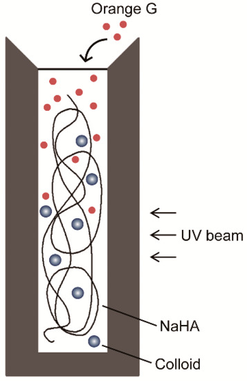 Experimental set-up for the measurement of solute permeation into sodium hyaluronic acid (NaHA) solution. A solution containing Orange G (0.1 mL) was poured over NaHA solution containing colloid (i.e., albumin or hydroxyethyl starch) in an ultraviolet (UV) cuvette.