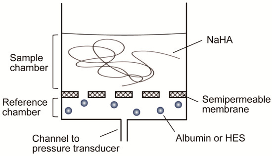 NaHA was dissolved in PBS to prepare a 1% (w/w) solution and left for 24 h to solidify with gentle stirring at room temperature. The osmotic swelling pressure of 1% NaHA solution was measured using an osmotic flow cell as previously reported [16,17]. The basic principle of the osmotic flow cell is as follows: two fluid chambers are separated by a semipermeable membrane (molecular weight cut-off, 300,000; ultrafiltration membrane disk PBMK; Merck Millipore, Burlington, MA, USA) (Figure 2), with one of the chambers serving as the sample chamber (filled with 0.5 mL 1% NaHA in PBS) and the other as the reference chamber (filled with PBS, 2% (w/v) albumin, or 2% (w/v) HES), which is connected via a narrow channel (0.5 mm diameter) to a manometric chamber fitted with an electronic pressure transducer (PGM-02KG, Kyowa, Tokyo, Japan). The volume of colloid-diffusing fluid space (i.e., reference and manometric chambers, and the channel connecting them) is 1.5 mL. Fluid movement from the reference chamber toward the sample chamber due to the osmotic swelling force of NaHA solution creates a negative hydrostatic pressure in the reference chamber, which equals the osmotic swelling pressure of NaHA solution against test colloid solutions. Hydrostatic pressure in the reference chamber was recorded every 10 s for 20 h using LabVIEW® (National Instruments, Austin, TX, USA). Experiments were repeated four times at room temperature.