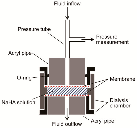 NaHA was dissolved in PBS to prepare 0.1% (w/w), 0.3% (w/w), and 0.5% (w/w) solutions and left for 24 h to solidify with gentle stirring at room temperature. Darcy’s permeability coefficient (K) of each NaHA solution was measured using the ultra-fast double-sided reusable sample dialyzerTM (outer diameter 2.5 cm, chamber volume 500 μL: 7404-5001D, Harvard Apparatus, Holliston, MA, USA) (Figure 3). The system interposed 0.5 mL of NaHA solution between two precut cellulose acetate dialysis membranes (molecular weight cut-off 300 kDa: 7403-CA300K, Harvard Apparatus, Holliston, MA, USA). PBS or 2% (w/v) colloid (i.e., albumin, HES) solution was infused into the dialysis chamber containing NaHA solution via a connecting tube with an automatic infusion pump (FP-2200, MELQUEST, Toyama, Japan) at a constant rate (Q) ranging from 1 to 20 μL/min (Figure 3).
