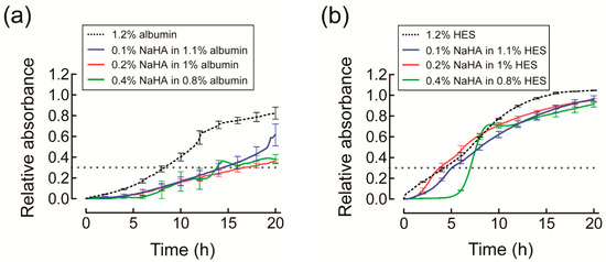 Time course of relative absorbance of Orange G permeating into different concentrations of sodium hyaluronic acid (NaHA) solution containing (a) albumin or (b) hydroxyethyl starch (HES). Relative absorbance of Orange G is expressed as a value relative to that calculated assuming that Orange G is uniformly distributed into NaHA solution in the ultraviolet cuvette. Experiments were carried out at least in triplicate. For simplicity, values are presented as mean and standard error for every 2 h. The dotted horizontal line indicates a relative absorbance of 0.3.