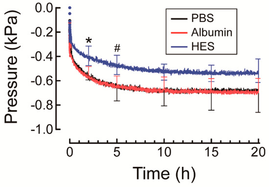 Hydrostatic pressure of PBS, 2% albumin, and 2% HES solutions measured in the reference chamber steeply decreased within 30 min, and thereafter gradually decreased until equilibrium was reached at roughly 15 h (Figure 5). HES had a higher hydrostatic pressure in the reference chamber at 2 h compared to PBS (p = 0.022) and albumin (p = 0.021) and at 5 h compared to PBS (p = 0.029). No significant difference in hydrostatic pressure was noted between PBS, albumin, and HES at other time points.