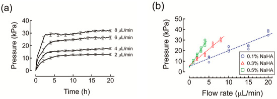 (a) Time course of changes in hydrostatic pressure in the pressure tube for 0.3% sodium hyaluronic acid solution (NaHA) at different infusion rates of phosphate buffered saline (PBS) in the measurement of Darcy’s permeability coefficient of NaHA solution. Experiments were carried out at 25 °C. For simplicity, values are presented as mean and standard error for every 2 h. (b) Relationship between infusion rates of PBS and hydrostatic pressure in the pressure tube at plateau for different concentrations of NaHA solution fitted with linear regression lines (dashed lines).