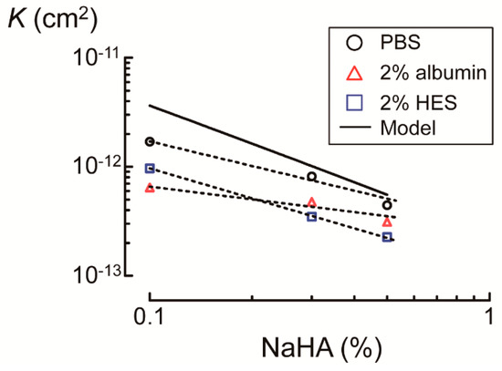 Comparison of Darcy’s permeability coefficients (K) of sodium hyaluronic acid (NaHA) solution when phosphate buffered saline (PBS) or 2% colloid solution (i.e., albumin or hydroxyethyl starch (HES)) was infused. Solid line denotes K values calculated by Equation (4) according to the hydrodynamic model of hyaluronic acid polymer networks. Dotted lines denote linear regression lines between logarithmic values of NaHA concentrations and K.