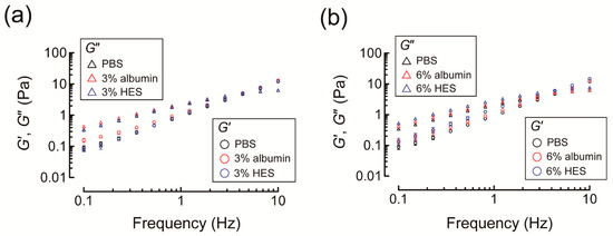 While the presence of 3% albumin in NaHA solution significantly increased G′ and G″ of NaHA solution relative to PBS at low frequency (i.e., <1 Hz), G′ and G″ of NaHA solution were similar for PBS and 3% HES (Figure 8a). Nevertheless, the increase in HES concentration from 3% to 6% significantly increased G′ and G″ of NaHA solution, resulting in larger G′ and G″ of NaHA solution compared to PBS and 6% albumin at all frequencies examined (Figure 8b).