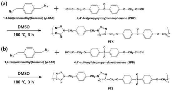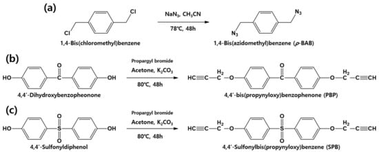 Diglycidyl ether of bisphenol A (DGEBA) and diglycidyl ether of bisphenol F (DGEBF) were purchased from Kukdo Chemical Co. Ltd. (Seoul, Korea). Triglycidyl p-aminophenol (TGAP) was purchased from Kukdo Finechem Co. Ltd. (Busan, Korea) and 3,3′-diaminodiphenylsulfone (3,3′-DDS) was purchased from Wakayama Seika Kyoto Co. Ltd. (Kyoto, Japan). Sodium azide (99.5%), α, α’-dichloro-p-xylene (98%), propargyl bromide (80 wt.% in toluene), 4,4′-dihydroxybenzophenone (99%), and 4,4′-sulfonyldiphenol (99%) were purchased from Sigma-Aldrich (St. Louis, MO, USA). Acetonitrile (95%), dichloromethane (99%), hexane (95%), and acetone (95%) were purchased from Duksan Chemical Co. Ltd. (Ansan, Korea).