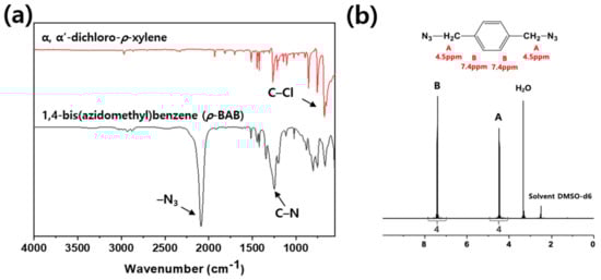 In Figure 3, the peak at 717 cm−1 arising from the chloromethyl group of 1,4-bis(chloromethyl) benzene is not observed after the reaction. New peaks appeared at 1250 and 2100 cm−1 after the reaction and were attributed to the C–N and –N3 from the azide group of p-BAB, respectively. In the 1H-NMR spectrum of p-BAB, the signals are observed at δppm = 4.5 from methylene proton and 7.4 from aromatic proton. The integral ratio of each peak is 4(A):4(B), which are in excellent agreement with the theoretical ratio of each peak.