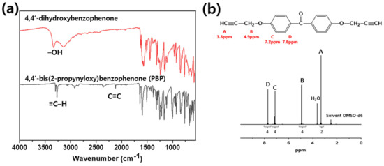 In Figure 4, the peak at 3380 cm−1 arising from –OH group of 4,4′-dihydroxybenzophenon is not observed after the reaction. New peaks at 2113 and 3262 cm−1 were attributed to the acetylene group of PBP. In the 1H-NMR spectrum, the signals are observed at δppm = 3.3 from acetylene proton, 4.9 from methylene proton, 7.2 from aromatic proton next to the ether group, and 7.9 from aromatic proton next to the ketone group. The integral ratio of each peak is 2(A):4(B):4(C):4(D), which are in excellent agreement with the theoretical ratio of each peak.