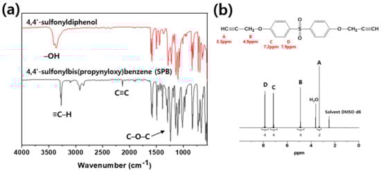 In Figure 5, the peak at 3360 cm−1 arising from –OH group of 4,4′-sulfonyldiphenol is not observed after the reaction. New peaks appeared at 1237, 2078, and 3270 cm−1 after the reaction. The new peak at 1237 cm−1 was attributed to the C–O–C group of SPB, and the new peaks at 2078 and 3270 cm−1 were attributed to the acetylene group of SPB. In the 1H-NMR spectrum of SPB, the signals are observed at δppm = 3.3 from an acetylene proton, 4.0 from methylene proton, 7.2 from aromatic proton next to the ether group, and 7.9 from the aromatic proton next to the sulfonyl group. The integral ratio of each peak is 2(A):4(B):4(C):4(D), which are in excellent agreement with the theoretical ratio of each peak.