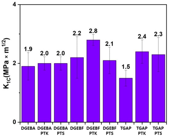 Figure 7 presents the fracture toughness of the prepared epoxy samples. When PTK or PTS was mixed with DGEBA, fracture toughness of DGEBA/PTK and DGEBA/PTS was improved by 7%, compared to the untoughened DGEBA. When PTK or PTS mixed with DGEBF, fracture toughness of DGEBF/PTK was improved by 27%, whereas the fracture toughness of DGEBF/PTS was similar to that of the untoughened DGEBF. When PTK and PTS were mixed with TGAP, fracture toughness was improved by 58% and by 51%, respectively, compared to that of the untoughened TGAP. These results suggest that the toughening effect of PTK is equal to or better than that of PTS, and the toughening effect of PTK or PTS differs depending on the type of epoxy resin. In the previous study, when TGAP/3,3′-DDS was toughened with PES, which is commercial engineering thermoplastics, the fracture toughness improved by 7% [24]. Therefore, PTK or PTS shows sufficiently excellent toughening effect compared to PES.