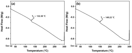 The thermal properties of PTK and PTS, which were polymerized in DMSO, were investigated using DSC and the results are shown in Figure 8. The Tg of PTK obtained by the reaction of p-BAB and PBP is 132.30 °C, while the Tg of PTS obtained by the reaction of p-BAB and SPB is 149.22 °C.